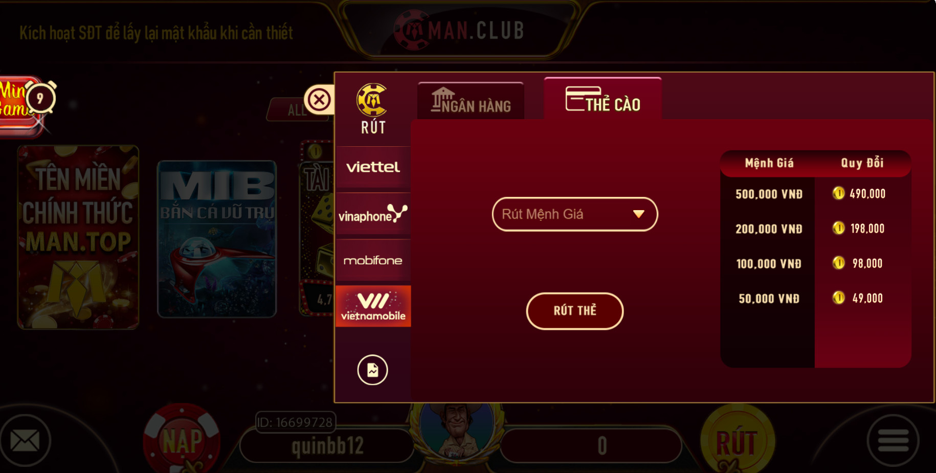 Sau khi tham gia trải nghiệm các tựa game hot tại Man Club, người chơi có thể chọn rút tiền qua tài khoản ngân hàng hoặc thẻ cào. Đây là 2 cách rút tiền từ MAN CLUB phổ biến nhất.
